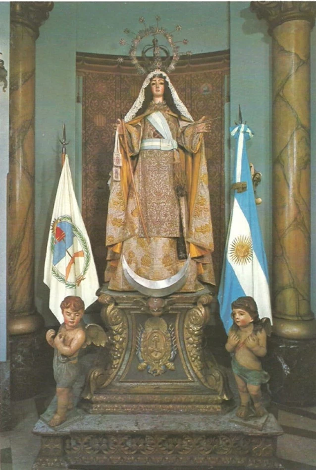 Histórica imagen de la Virgen de la Merced, con el bastón de mando del General Belgrano con el que la invistiera Generala y Patrona del Ejército en la Batalla de Tucumán (24 de septienbre de 1812). Desde 1913 se venera en la Basílica Nuestra Señora de los Buenos Aires de esta capital.