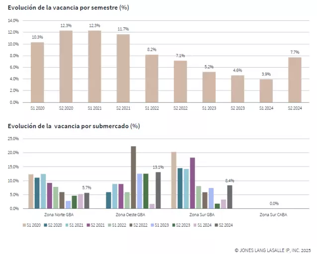 En términos de disponibilidad, se registraron 167.453 m² en oferta para alquiler, lo que elevó la tasa de vacancia al 7,7 %. Este incremento del 3,7 % en comparación con el primer semestre del año se debió, en parte, a la entrada de nuevos desarrollos al mercado. Entre los submercados, la Zona Oeste del Gran Buenos Aires (GBA) presentó la mayor disponibilidad, con una vacancia del 13,1 %, seguida por Zona Sur GBA (8,4 %) y Zona Norte GBA (5,7 %).