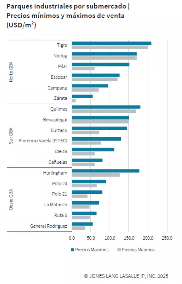 En cuanto a los terrenos en parques industriales, el precio promedio solicitado alcanzó los USD 102,3 por m², representando un incremento del 4,2 % respecto al semestre anterior. Zona Norte GBA destacó con un rango de precios que osciló entre USD 10 y USD 208 por m². Mientras tanto, en Zona Oeste GBA los valores variaron entre USD 35 y USD 177 por m², y en Zona Sur GBA se ubicaron entre USD 60 y USD 180 por m².