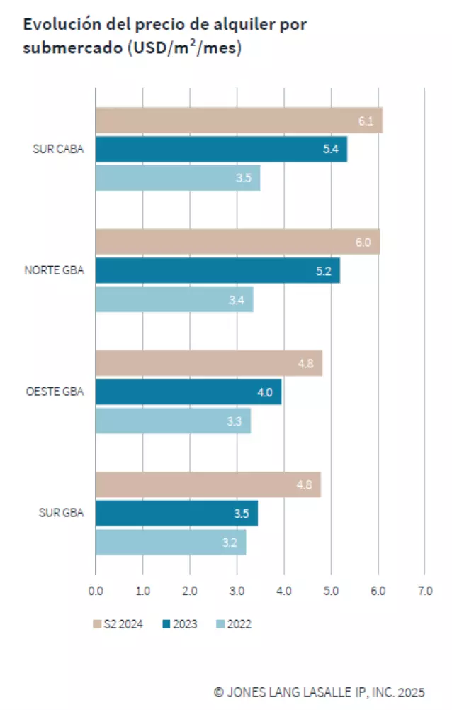 El precio promedio solicitado por metro cuadrado alcanzó los USD 7,5 por mes, marcando un aumento del 4,0 % respecto al semestre anterior. En el desglose por submercado, Zona Norte GBA lideró con un valor de USD 7,8 por m² por mes, seguida por Zona Oeste GBA (USD 7,6) y Zona Sur GBA (USD 7,2).