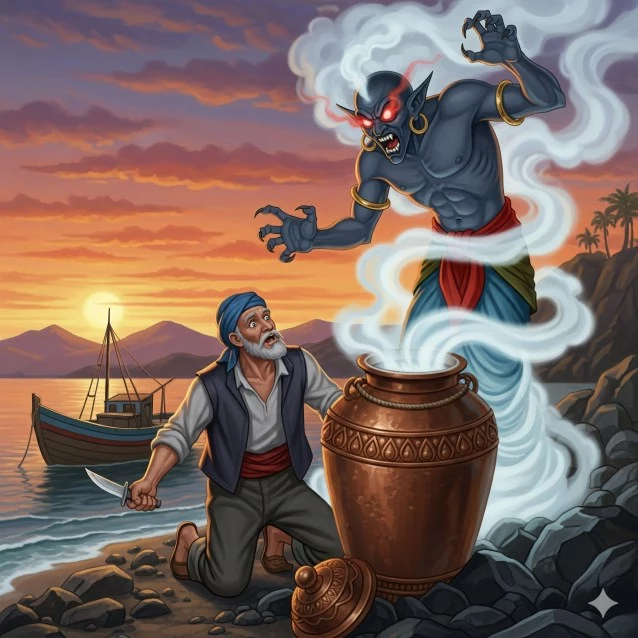 En razón de su peligro, muchos demonios literarios son encerrados en botellas o redomas. La versión más antigua de esta versión figura en relato El pescador y el efrit en el Libro de las mil y una noches. Un pescador recoge con su red una vasija sellada, al abrirla, surge un enorme genio (efrit) encerrado por el rey Salomón; durante siglos el efrit pensó en recompensar a quien lo liberara, luego su generosidad muda en crueldad y jura matar a su liberador. Historia similar a la del protagonista del relato El diablo en la botella de Robert Louis Stevenson, en la serie de sus cuentos ambientados en los mares del sur.