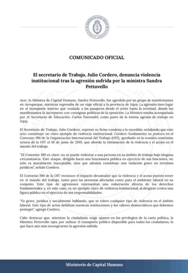 "Cabe destacar que, mientras la ciudadanía exige ajustes en los privilegios de la casta política, la Ministra Pettovello opta por utilizar el transporte público disponible para todos los ciudadanos, lo que hace aún más incongruente la agresión sufrida" , finaliza el documento oficial.