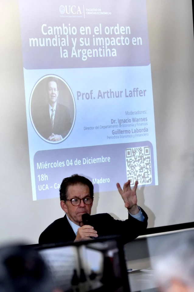 Académico laureado, el profesor Arthur Laffer visitó el miércoles las instalaciones de la Universidad Católica Argentina, donde en una sala repleta de docentes y estudiantes de Economía expuso su punto de vista acerca del impacto positivo de la quita de impuestos para dinamizar al sector productivo y recalcó la necesidad de que el mundo finalmente vaya hacia el libre comercio.