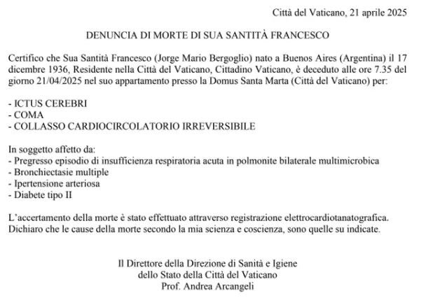 El documento, firmado por el director de Sanidad e Higiene del Estado de la Ciudad del Vaticano, Andrea Arcangeli, certifica que la muerte se produjo a las 7:35 horas locales (5:35 GMT) del 21 de abril en su apartamento, la residencia vaticana Casa Santa Marta.