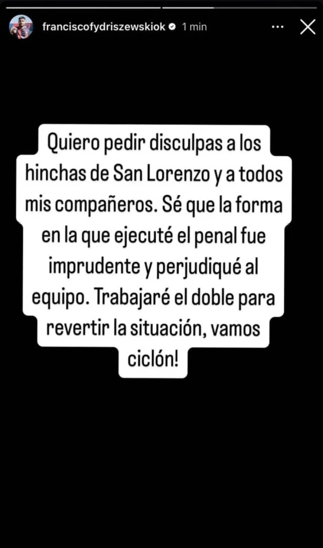 Tras el encuentro y luego del estallido, el delantero se lamentó. "Quiero pedir disculpas a los hinchas de San Lorenzo y a todos mis compañeros. Sé que la forma en la que ejecuté el penal fue imprudente y perjudiqué al equipo", publicó en sus redes. Lo primero es reconocer el error. Fydriszewski se equivocó y pagó. Ya está. Le puede pasar a cualquiera en cualquier rubro.