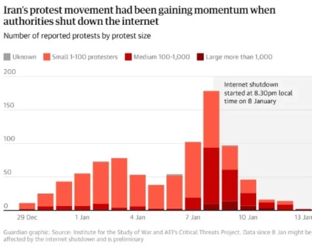 Debido al apagón de Internet impuesto en el país y la cobertura distorsionada proporcionada por los medios occidentales, es difícil reconstruir exactamente lo que sucedió en Irán. Pero si nos atenemos a un gráfico ilustrativo de esta nota del periódico The Guardian basado en datos recogidos por centros de estudios estadounidenses, las manifestaciones fueron en realidad relativamente pequeñas y aunque se extendieron por todo el país, la participación fue reducida. Solo unas pocas docenas, según informes, superaron las mil personas.