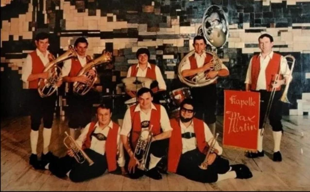 REMINISCENCIAS DEL CENTENARIO DE LA INMIGRACION: La “Blaskapelle” de Max Martin, en una de sus formaciones iniciales, junto con su director (centro de la fotografía). Esa orquesta de instrumentos de viento, integrada en la ocasión por más de quince músicos, viajó a la Argentina en 1978, por iniciativa de Schwaben International (Stuttgart). Procedentes de Ravensburg –Alemania los ejecutantes dieron brillo a los Festejos del Centenario de la Inmigración de los alemanes del Volga en cuatro provincias argentinas: Entre Ríos, Chaco, La Pampa y Buenos Aires, para culminar en Capital Federal, el domingo 26 de febrero de 1978. (Ph: gentileza de Philipp Kempf, integrante de la “Blaskapelle”).