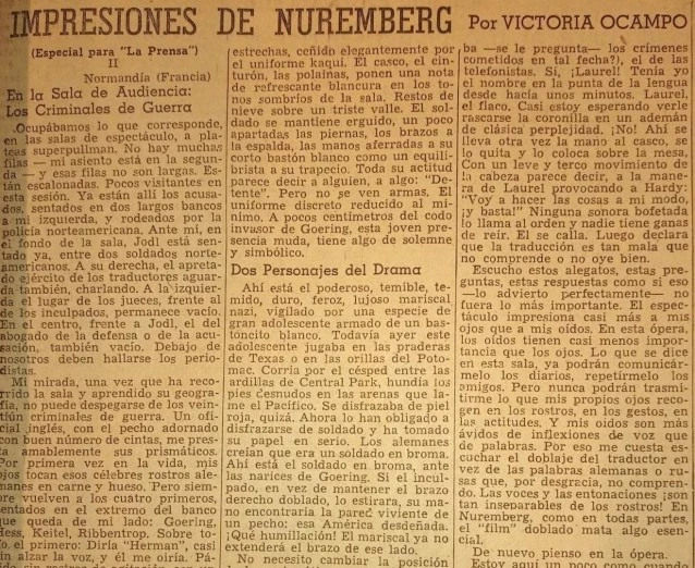 Victoria Ocampo, invitada por la British Council, escribió para este diario tres crónicas de las jornadas de los juicios de Núremberg que fueron publicadas el martes 1°, el miércoles 2 y el jueves 3 de octubre de 1946. Fue la única mujer latinoamericana y argentina que presenció el acontecimiento.