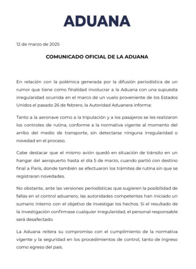 A través de un comunicado, la Aduana negó cualquier irregularidad en el control de un avión proveniente de los Estados Unidos, pero confirmó que inició una investigación interna tras una denuncia periodística.