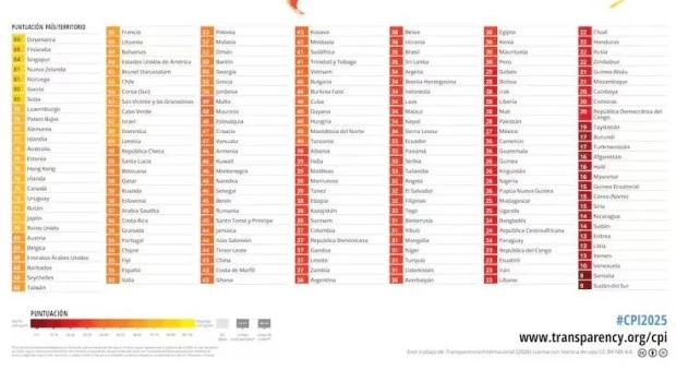 Los países de la región reciben en el IPC de 2025, en el que la ONG clasifica a 182 países y territorios, una puntuación media de 42 sobre 100, siendo cero la peor (mucha corrupción) y cien la mejor (muy baja corrupción).