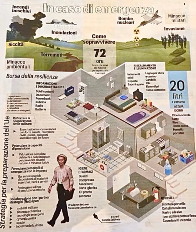 Los políticos atlantistas y el Alto Mando de la OTAN, invocan gritos de guerra, por ejemplo las palabras del Almirante Rob Bauer, presidente del Comité Militar: “debemos darnos cuenta de que vivir en paz no es un hecho. Y es por eso que nosotros (OTAN) nos estamos preparando para un conflicto con Rusia” y dice “toda la sociedad estará involucrada en el conflicto, nos guste o no .... tendremos que organizarnos para tener agua, una radio de batería y una antorcha de batería para superar los primeros 36 horas ”. Recomendamos ver este video en el que la comisaria europea Hadja Lahbib, recomienda a los europeos tener su kit de supervivencia.