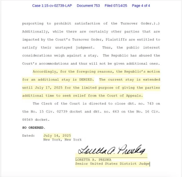 El Gobierno nacional le había solicitado a Preska un “stay” (suspensión temporaria de la sentencia) dado que continuará con sus acciones judiciales en los estrados estadounidenses.