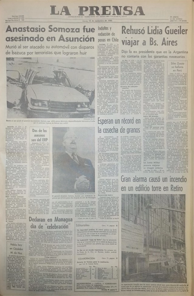 No contó con mucho tiempo para hacerlo. A los 55 años de edad, el 17 de setiembre de 1980, fue asesinado en Asunción del Paraguay, donde le había dado asilo político el general Alfredo Stroessner. Somoza cayó en una emboscada, tendida por la organización terrorista argentina ERP. El autor material del hecho, que utilizó contra su Mercedes Benz un lanzagranadas antitanque de fabricación soviética –y único abatido por las fuerzas paraguayas– fue Hugo Irurzún. Curiosamente, este guerrillero, conocido como “Comandante Santiago” había sido vencido en el combate de Manchalá, en Tucumán, durante el Operativo Independencia. El 28 de mayo de 1975, lo hicieron retroceder junto a sus 140 hombres, un puñado de soldados conscriptos al mando del cabo primero Gerardo Lafuente.