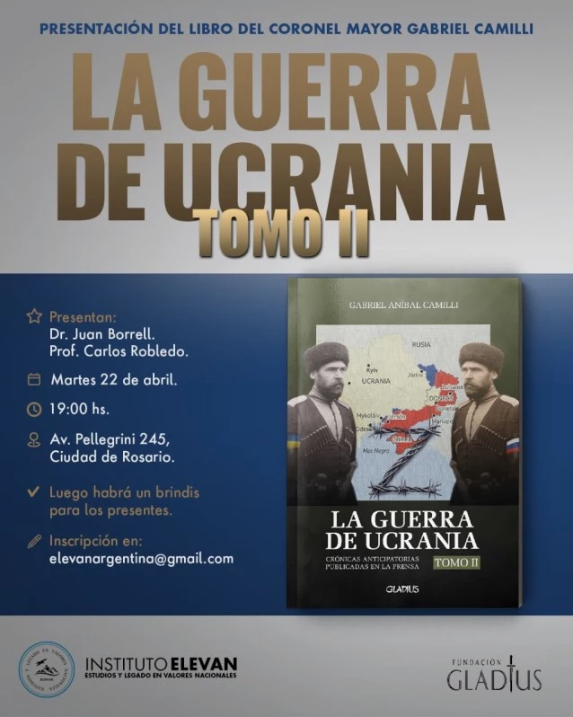 El martes 22 de abril, a las 19, será presentado el libro “La guerra de Ucrania” Tomo 2 del Cnl My (R) Gabriel Aníbal Camilli. El evento se realizará en la Avenida Pellegrini 245 de la Ciudad de Rosario. La nueva obra que reúne los artículos del Director del Instituto ELEVAN publicados en el diario La Prensa, será presentada por el doctor Juan Borrel y el profesor Carlos Robledo. Luego de la presentación se llevará a cabo un brindis. La inscripción se puede realizar en elevanargentina@gmail.com. Organizan el Instituto ELEVAN y la Fundación Gladius.
