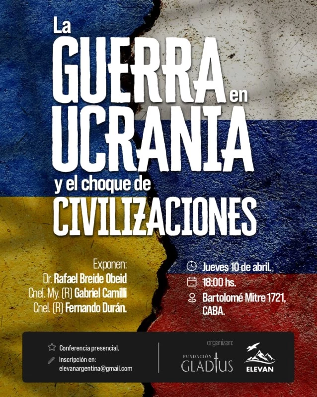 El próximo jueves 10 de abril se llevará a cabo una conferencia presencial acerca del conflicto bélico europeo que ya lleva tres años. El doctor Rafael Breide Obeid, el coronel mayor (R) Gabriel Camilli y el coronel (R) Fernando Durán expondrán acerca de “La guerra en Ucrania y el choque de civilizaciones”. La misma se realizará, a partir de las 18, en la calle Bartolomé Mitre 1721. Organizan la Fundación Gladius y el Instituto ELEVAN. Para mayor información e inscripción: elevanargentina@gmail.com