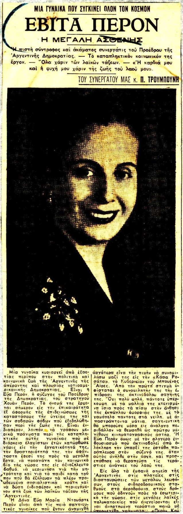 La extensa nota se completó con telegramas previos del citado corresponsal hora antes del deceso de Evita, además de sumar “apuntes biográficos” de la difunta, la obra de su Fundación, su gira europea y la labor política llevada adelante, para luego reflexionar sobre el destino de Perón, al cual le augura un destino fatal en lo político. En tanto el diario “Athinaiki”, también del día 28, se hizo eco de un cable de Londres del periodista P. Troumbounis, que expresó: “El cáncer la venció. Evita ha muerto. Larga lucha con la muerte. Se comunica de Buenos Aires que Eva Perón, esposa del presidente de la República Argentina, ha muerto el sábado a la noche”.