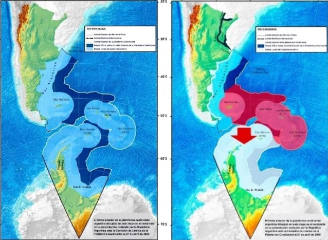 Más aún, a raíz de las presentaciones británicas sobre el límite de la plataforma continental de los tres grupos de Islas, la invasión, ocupación ilegal y usurpación de recursos naturales se extiende a una superficie de casi 2.600.000 km2. Es decir, casi otra Argentina continental usurpada en el mar. El mar ilegítimamente en poder del Reino Unido es el doble del que Argentina tiene bajo su poder.