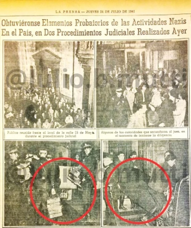 El juez Vásquez tomó cartas en el asunto rápidamente. El 23 de julio de 1941, la policía allanó en simultáneo la sede la Unión Alemana de Gremios, en Alsina 1250, primer piso, y las oficinas del Círculo Alemán de Beneficencia y Cultura, en 25 de mayo 145, el edificio del Banco Germánico. En este último funcionaba también la Embajada del Tercer Reich en los pisos superiores. Ambos edificios hoy se mantienen en pie y son testigos silenciosos de lo que ocurrió aquella agitada noche de invierno de 1941.