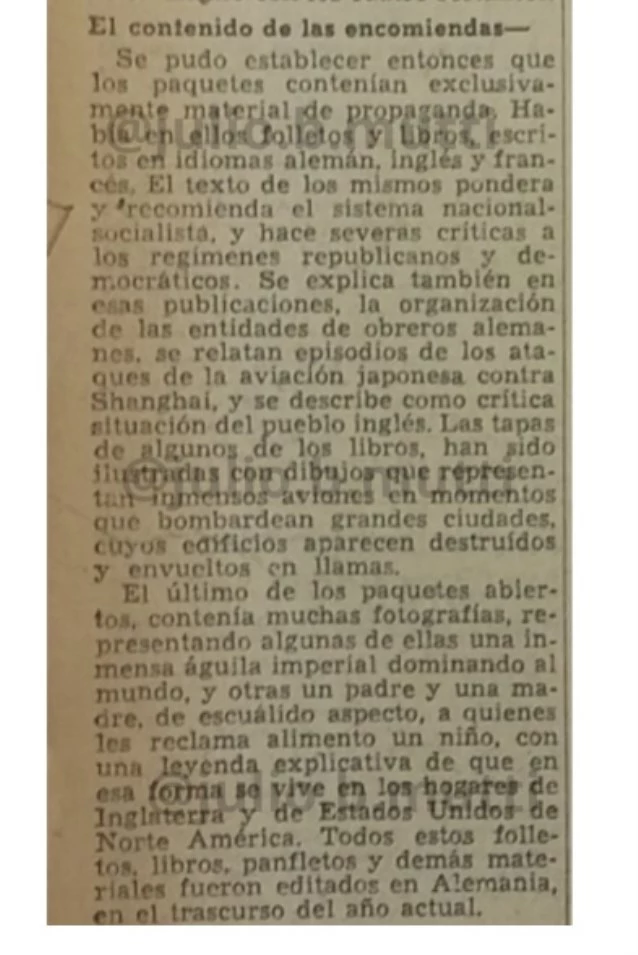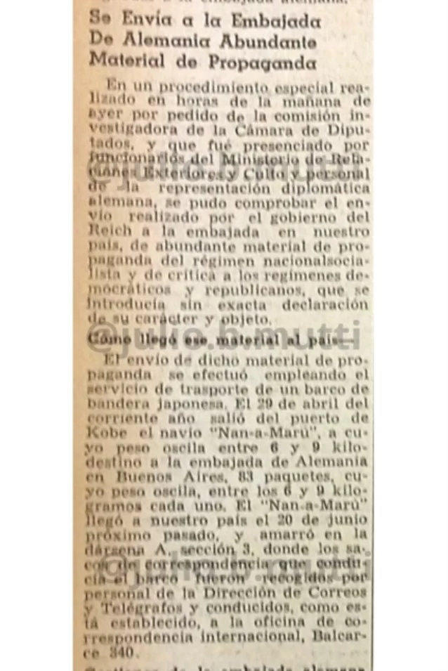 Como dije, todo sucedió casi al mismo tiempo, y el material de propaganda nazi que llegó en el vapor japonés, que probablemente también está dentro de lo hallado en la Corte, fue una causa de menor importancia en comparación con los allanamientos y el transmisor de alta potencia.