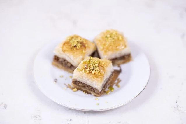 Los postres son los clásicos árabes, con mamul de nuez, damasco o dátiles (dulce a base de manteca, relleno de nueces y especias, damasco y almendras o pasta de dátiles y nuez), baklava (capas de masa fila rellena con nueces y embebida en almíbar especiado) y dedos de novia (masa filo con una mezcla de variados frutos secos).