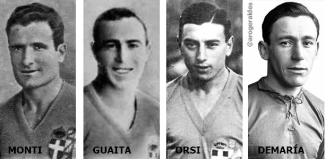 Los cuatro argentinos campeones con Italia en 1934: Monti, Enrique Guaita, Raimundo Orsi y Atilio Dimaría.