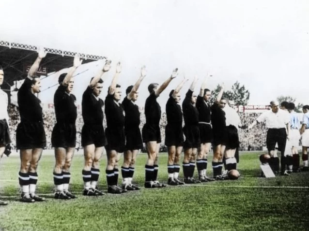 Vestida de negro, Italia hace el saludo fascista antes del partido contra Francia en 1938.