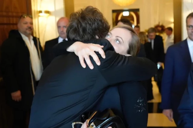 Milei, acompañado por su hermana Karina Milei y parte de su gabinete, protagonizó una escena de calidez junto a Meloni, quien encabezó la delegación italiana. Ambos compartieron palabras breves y un fuerte abrazo, reflejando el vínculo político y personal que construyeron en los últimos meses.