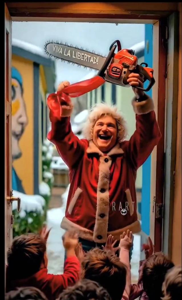 El Jefe del Estado argentino aparece vestido de Papá Noel y alzando una motosierra en la que se puede leer "Viva la libertad".