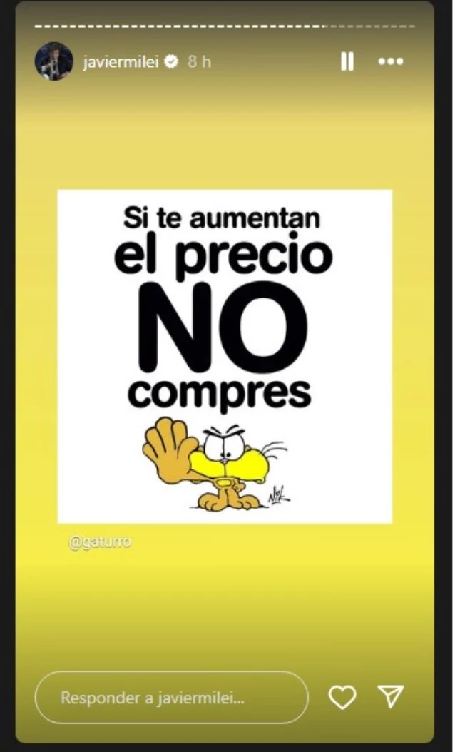 En medio de la presión por los aumentos de precios, el presidente Javier Milei publicó una imagen en sus redes sociales que sorprendió a propios y ajenos: compartió una viñeta de Gaturro con una consigna clara y directa contra la suba de productos. “Si te aumentan el precio, NO compres”, dice el posteo que apareció este jueves en sus historias de Instagram.