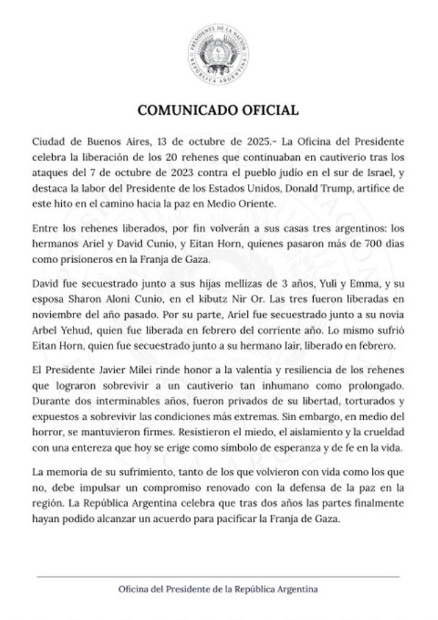 A través de su cuenta de X, el mandatario expresó: “Mi más profunda admiración y gratitud al Presidente Donald Trump por su extraordinario liderazgo y su coraje para poner fin a la guerra, logrando además la liberación de todos los rehenes, entre ellos tres argentinos —Eitan Horn, Ariel y David Cunio—”.