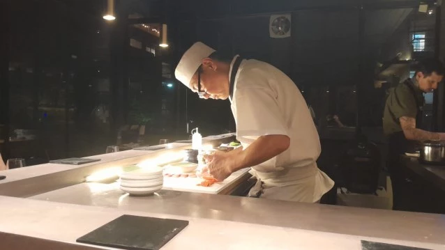 Bien puntual, a las 21 en la barra omakase (ubicada estratégicamente en un sector rodeado de vidrios, en un costado de 'Mixtape)', un grupo de clientes se agrupa frente a la barra. Allí, el maestro Takeshi Shimada comienza con su show. Shimada, inmigrante japonés con gran experiencia en eso de preparar platos deliciosos sonríe, saluda, va explicando.