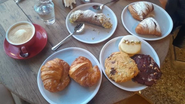 Mientras se toma café sentado, se ve gente que entra y sale a comprar pastas y los otros productos en venta. Son gente del barrio, muchos con perritos, saludan, se conocen entre sí y a la gente del mostrador.