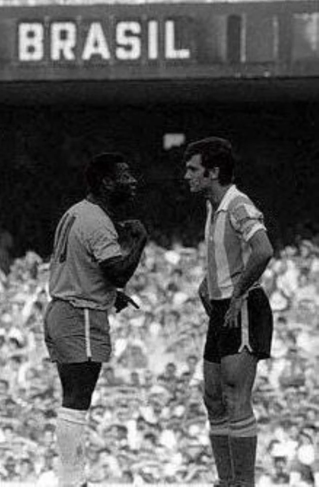 Cara a cara con Pelé en un duelo con Brasil. La cinta de capitán abriga el brazo izquierdo del Mariscal.