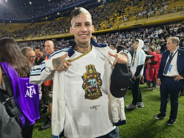 Es habitual que cada presentación del Seleccionado en el país sea acompañada por personalidades de diferentes ámbitos. Este ensayo contra Mauritania no fue la excepción y fueron varios lo que se dejaron ver en La Bombonera, como hizo L-Gante, quien se las ingenió para ingresar en el campo de juego. El cantante lucía una muy linda remera que tenía una imagen de Lionel Messi sentado en un trono. Sin dudas, el rosarino es hoy por hoy el rey del fútbol.