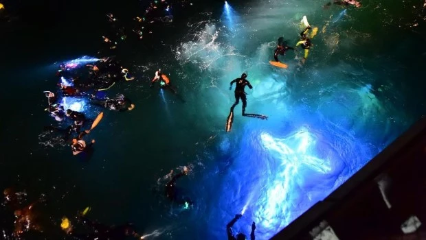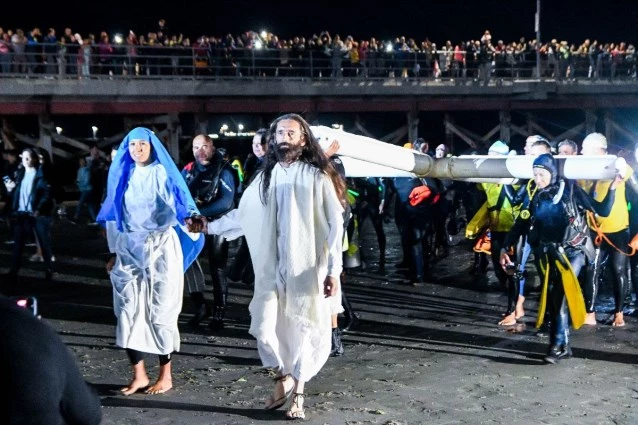 El evento central de estas fechas es, sin duda, el Vía Crucis Submarino, una ceremonia que cuenta con la bendición papal desde 2014. La procesión comienza el viernes en la Parroquia Sagrado Corazón de Jesús y culmina el sábado en el Muelle “Comandante Luis Piedra Buena”. Allí, una cruz de casi cuatro metros de altura se sumerge en el Golfo Nuevo para recorrer las estaciones restantes bajo el mar. Guiados por un hidrófono que relata la pasión de Cristo, buzos profesionales —incluyendo al histórico "Pinino" Orri— transportan la cruz a ocho metros de profundidad, mientras una procesión de kayakistas y embarcaciones los sigue desde la superficie bajo la luz de las velas y las linternas subacuáticas.