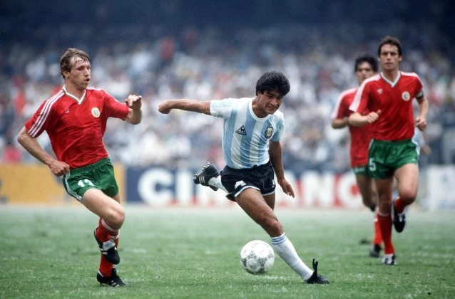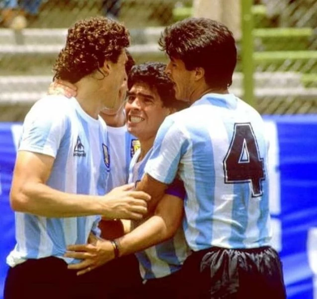 Gol argentino en México 86 y un festejo con Jorge Valdano y Maradona.