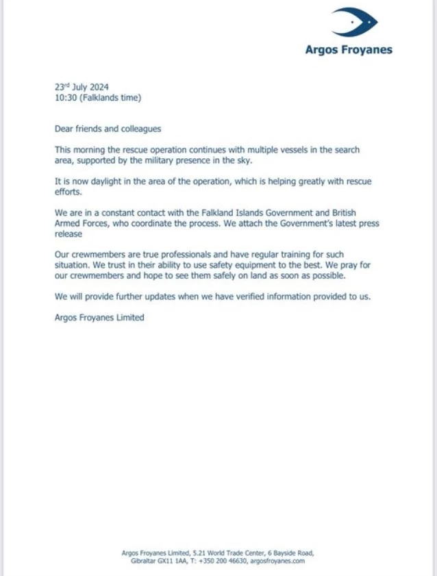 “Tras un incidente ayer por la tarde a unas 200 millas náuticas al este de Stanley que provocó inundaciones incontroladas, 27 miembros de la tripulación del barco pesquero Argos Georgia fueron obligados a abandonar el barco poco después de las 4 PM, hora local, y los miembros de la tripulación se subieron a balsas salvavidas. El BFSAI A- 400M ‘Atlas’ fue el primer activo en la escena y pudo rastrear e informar la posición y la posición de las balsas salvavidas”, informó el gobierno kelper mediante un comunicado.