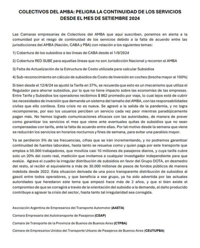 El comunicado fue firmado por la Asociación Argentina de Empresarios del Transporte Automotor (AAETA), la Cámara Empresaria del Autotransporte de Pasajeros (CEAP), la Cámara de Transporte de la Provincia de Buenos de Buenos Aires (CTPBA), y la Cámara de Empresarios Unidos del Transporte Urbano de Pasajeros de Buenos Aires (CEUTUPBA).