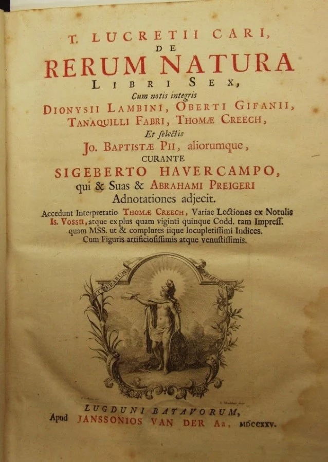 Finalmente, tras un largo periplo por el sud germánico, en una abadía benedictina Poggio halló la perla que eclipsó a todos los otros textos que había encontrado en su viaje: una copia del manuscrito “De rerum natura” (Sobre la naturaleza de las cosas), extenso poema del gran poeta y filósofo Lucrecio, de una distinguida familia romana y de quien se sabe muy poco, escrito el siglo anterior al nacimiento de Cristo en sublimes versos latinos.