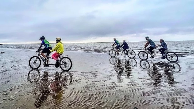 Son las nueve y media de un sábado a la mañana en el vial costero de Vicente López. El panorama es el de cualquier fin de semana soleado frente al Río de la Plata en que grupos de personas practican deporte al aire libre o simplemente comparten un mate bajo un cielo celeste. Sin embargo, a la altura de la calle Urquiza, un grupo se destaca del resto por el brillo de sus estructuras metálicas y la particularidad de sus movimientos que provienen de las bicicletas Tándem, esos vehículos de dos o más ruedas diseñados para que el esfuerzo de pedalear sea una tarea compartida.