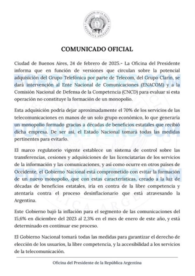 El comunicado de la Oficina del Presidente ante la venta de Telefónica de Argentina: