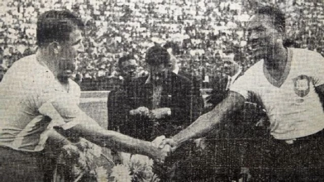 Salomón saluda al capitán brasileño Domingos Da Guia antes del partido decisivo del Sudamericano de 1946.