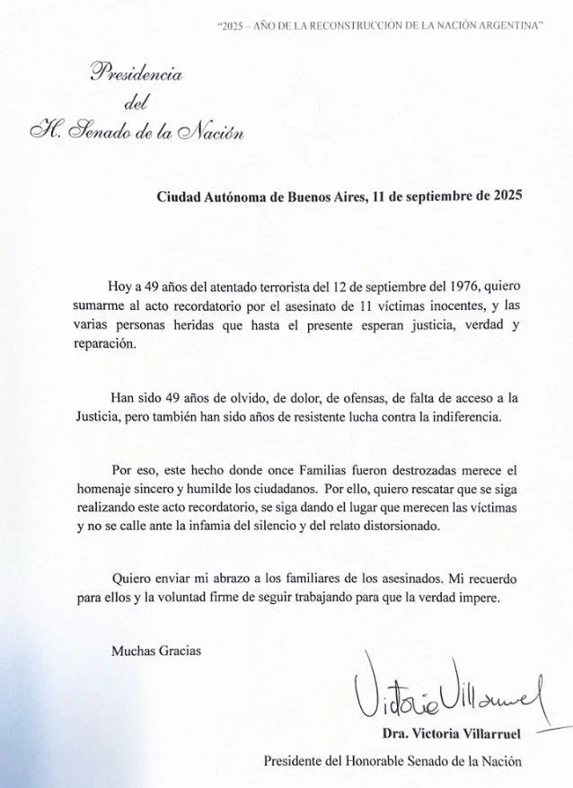 “Hoy, a 49 años del atentado terrorista del 12 de septiembre de 1976, quiero sumarme al acto recordatorio por el asesinato de once víctimas inocentes y las varias personas heridas que hasta el presente esperan justicia, verdad y reparación”, comienza el texto de la vicepresidente, que fue leído en el acto celebrado frente al monumento a las víctimas, erigido en las calles Junín y Rawson de Rosario, donde ocurrió el ataque.