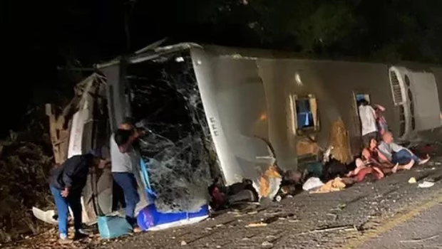 Según la Policía Federal de Carreteras, el siniestro ocurrió después de que uno de los neumáticos del vehículo reventó y el conductor perdió el control del autobús que se salió de la vía y terminó volcado a un costado de la carretera.