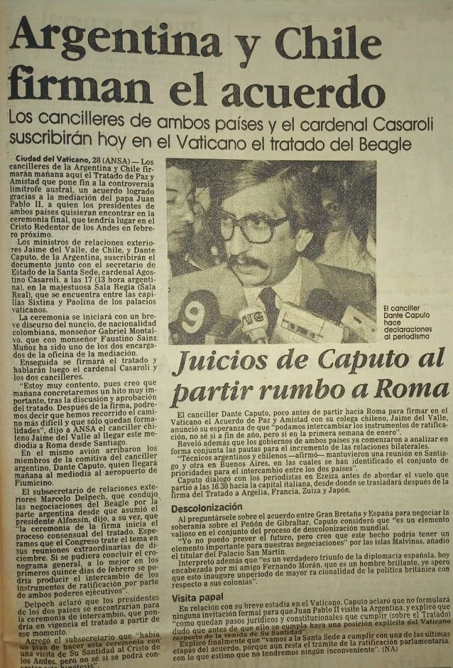 Otro conflicto internacional subsistía aún luego de la restauración democrática. El mismo que había mantenido en vilo al país en plena dictadura, la disputa limítrofe con Chile sobre el Canal de Beagle y sus islas, por cuya posesión ambas naciones estuvieron literalmente al borde de la guerra en 1978. La disputa llevaba casi cien años y varias tratativas fallidas, entre ellas una mediación de la corona británica rechazada por nuestro país. Las dos sangrientas dictaduras que asolaron a estas naciones de Sudamérica atisbaban una suerte de relegitimación de corte chauvinista fronteras adentro en la posibilidad de un enfrentamiento armado.