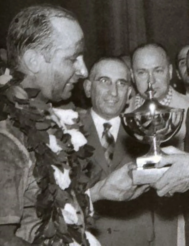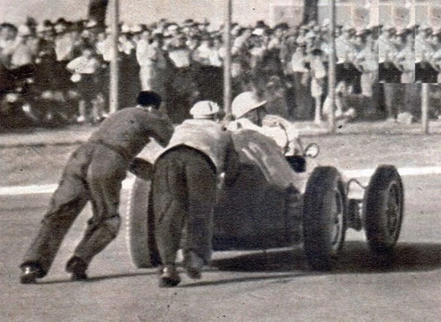 El arrecifeño José Froilán González, uno de los integrantes de la escudería Ferrari, escoltó a su compatriota al recibir la bandera a cuadros. El Cabezón se mantuvo en la pista a lo largo de 60 giros. Víctima de insolación, entregó su auto sucesivamente a sus compañeros Giuseppe Farina y Maurice Trintignant, con quienes compartió el segundo puesto en la clasificación final.