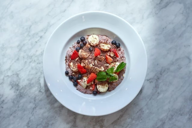 * Quina breakfast bowl con labneh, frutillas, arándanos, banana y almendras tostadas.