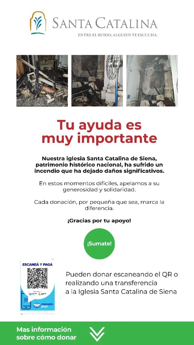Finalmente, el rector agradeció a los vecinos y organismos gubernamentales que se acercaron o llamaron para interiorizarse sobre la situación de la iglesia. El sacerdote explicó que se lanzó una campaña para restaurar el altar y cambiar la instalación eléctrica en el edificio, lo que permitirá mayor seguridad y conservación de estos antiguos espacios de más de 300 años de existencia. Para contribuir se puede donar a Banco Río Cuenta Nro 087.003533/6 CBU 0720087820000000353368 Cuit 33.63666407.9 o ALIAS: STA.CATALINA donde se juntará el dinero para desarrollar los trabajos.